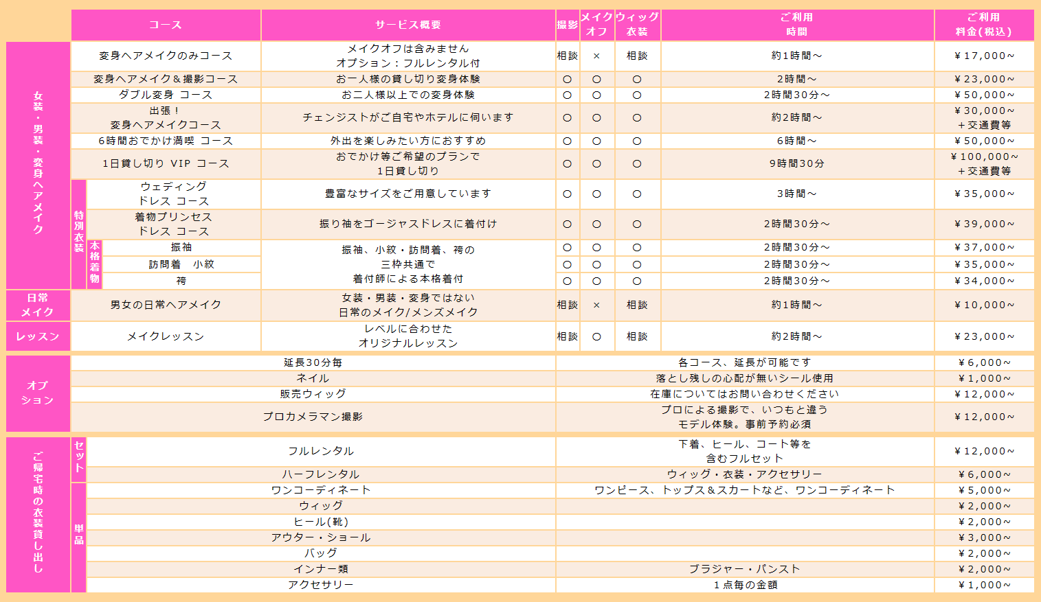 | 女装・男装・変身ヘアメイク | 変身ヘアメイクのみコース | メイクオフは含みません オプション:フルレンタル付 |